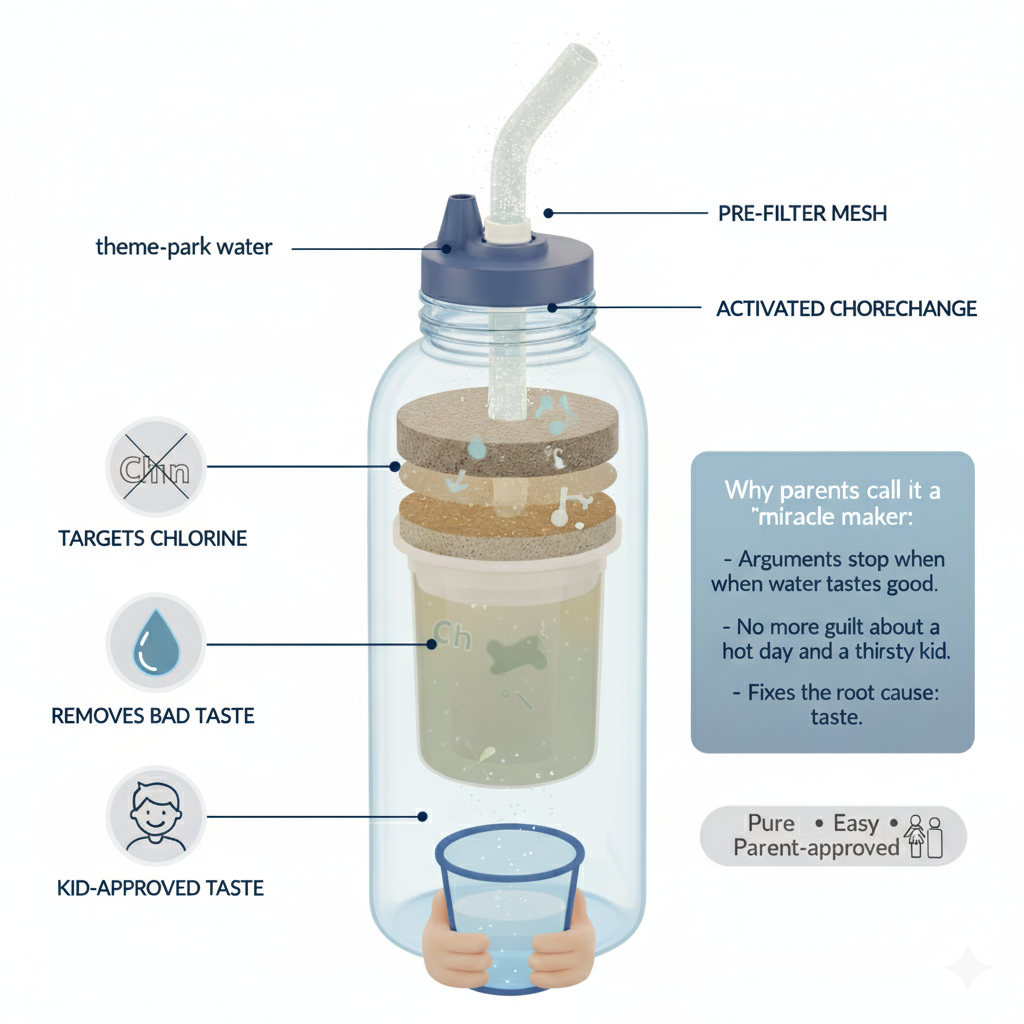 The real trip-killer is dehydration. Kids refuse water if it tastes off. This bottle’s filter targets chlorine (the #1 taste culprit) plus other chemicals—so tap water tastes like clean bottled water.