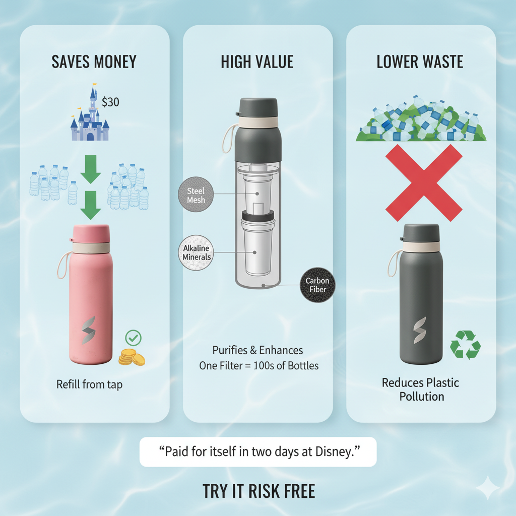 Bottled water at parks/hotels adds up fast. This bottle pays for itself on Day 1–2 of your trip by refilling from any tap.