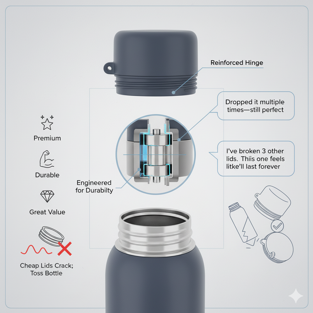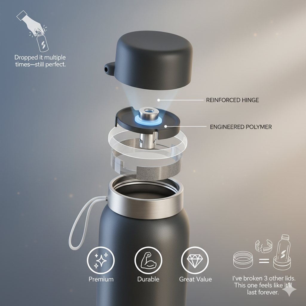 Cheap lids crack; then you toss the whole bottle. Our reinforced hinge is engineered for years of daily flips and drops.