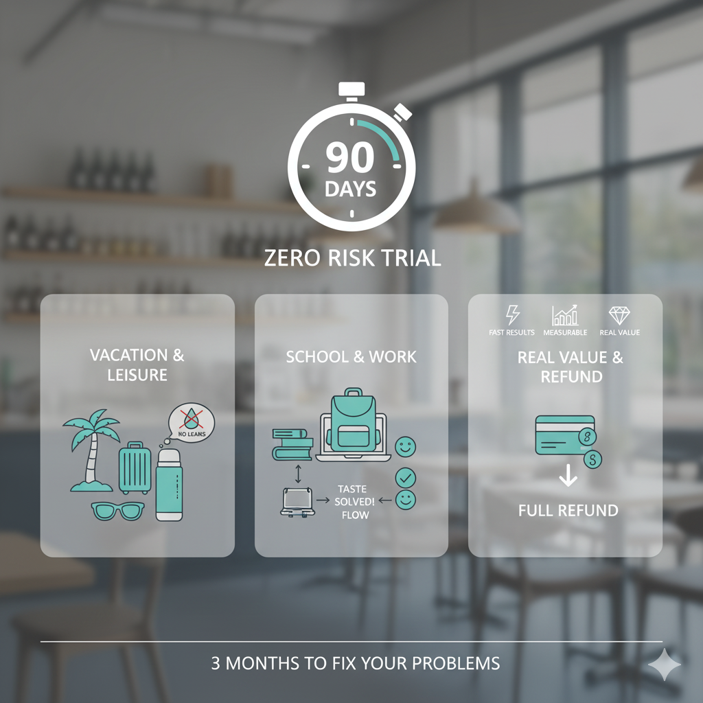 Take it on vacation. Use it for school and work. If it doesn’t solve taste, leaks, or flow, you get a full refund.