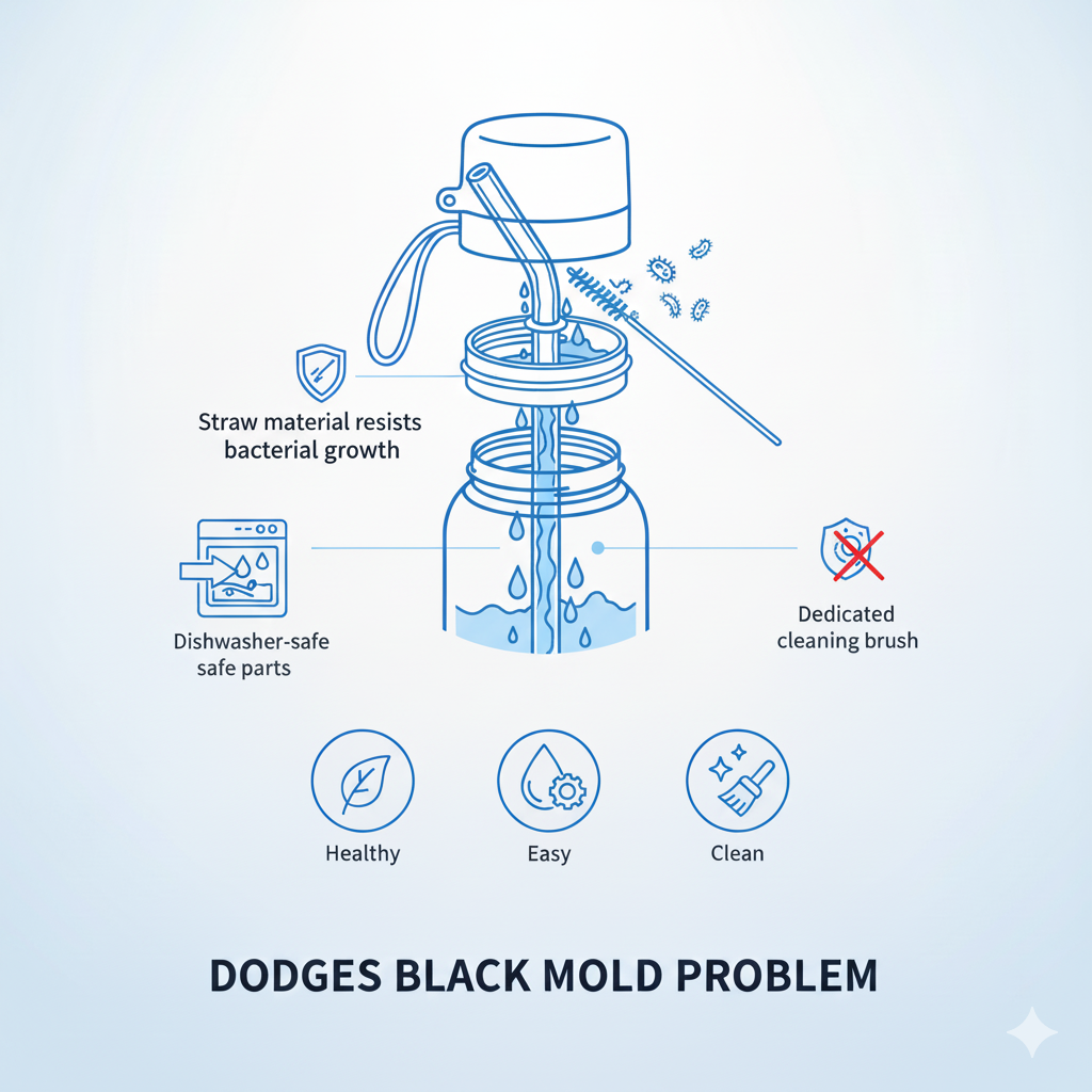 Straw material helps naturally resist bacterial/mold growth; all parts are dishwasher-safe and include a dedicated cleaning brush.
